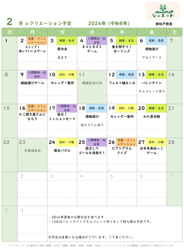 2月のレクリエーション予定をお届けします♪